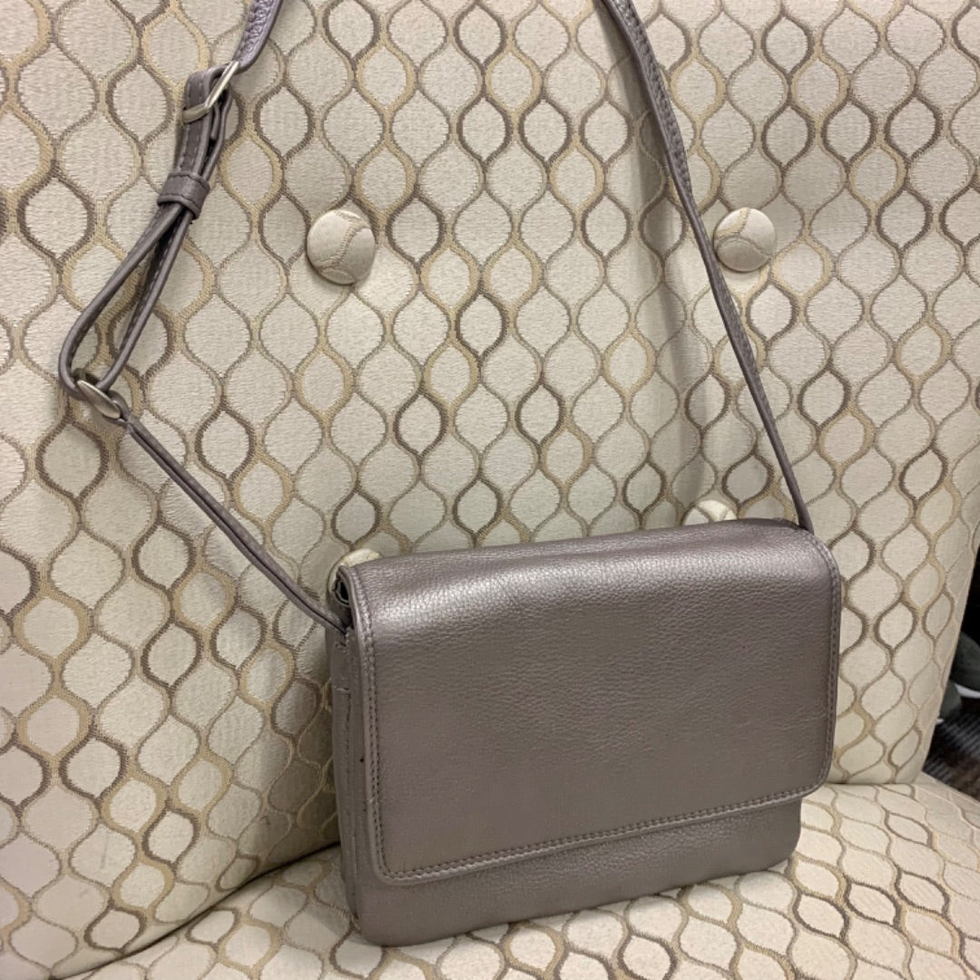 A small crossbody half flap from Derek Alexander. With 1 zipper and three 'flapover' open compartments. Enough for your wallet, phone, sunglasses and some small essentials. In a chique silver grey.
