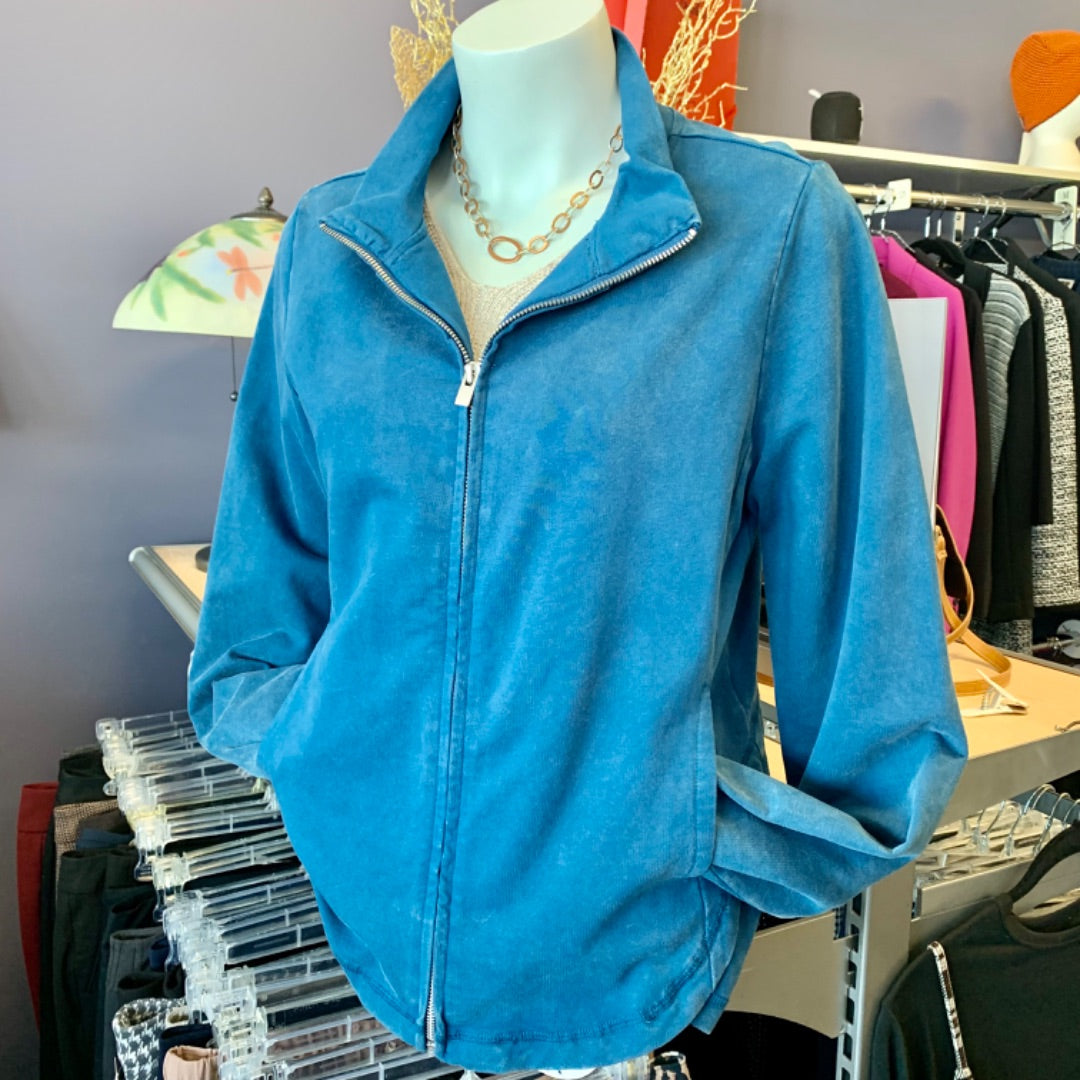 A very generous Small, more a Medium) zipper up for everyday in a weathered like jersey. With pockets, cut just a little different for a dressy casual look.