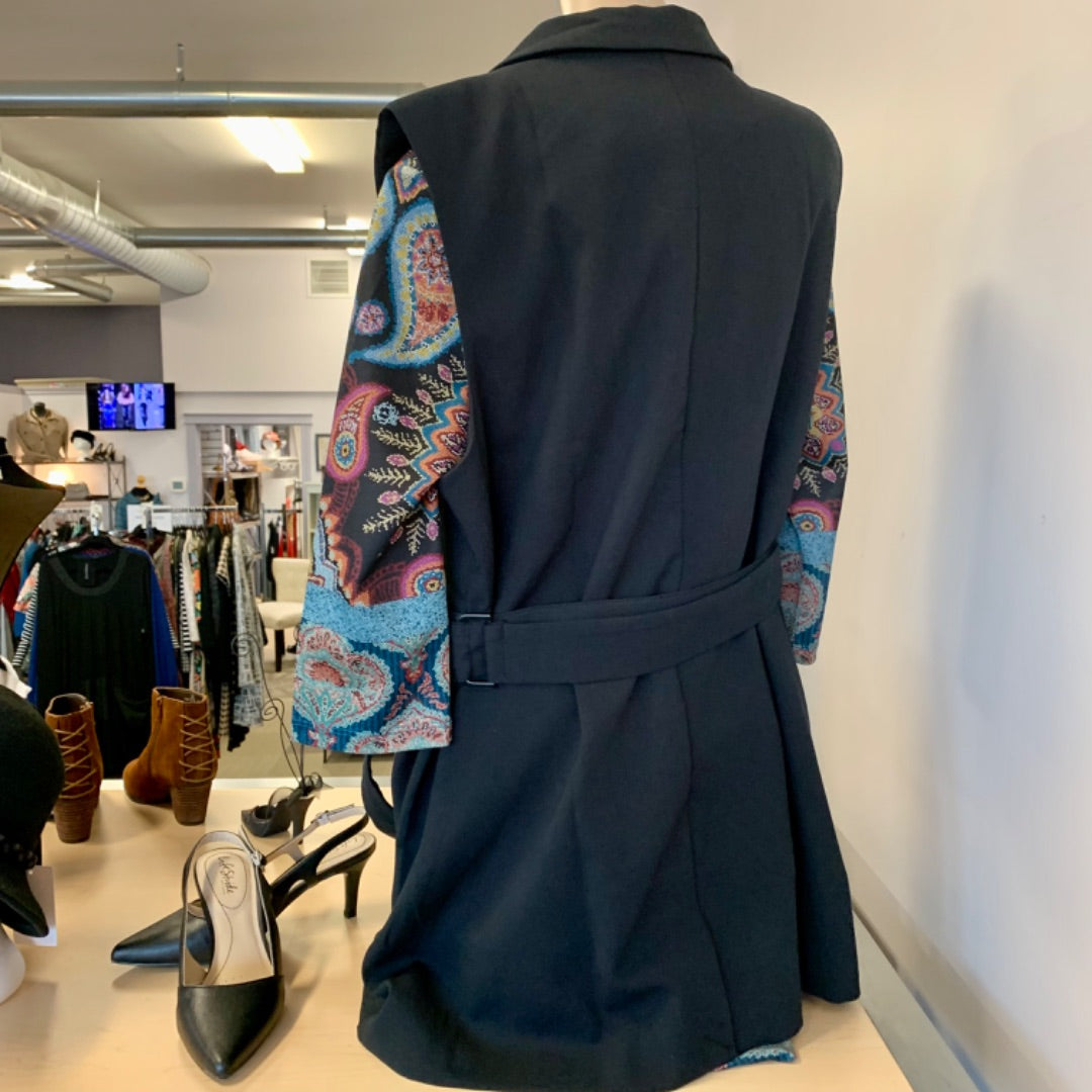 A button up longer vest with a belt - stylish and an extra layer of you are cold.
