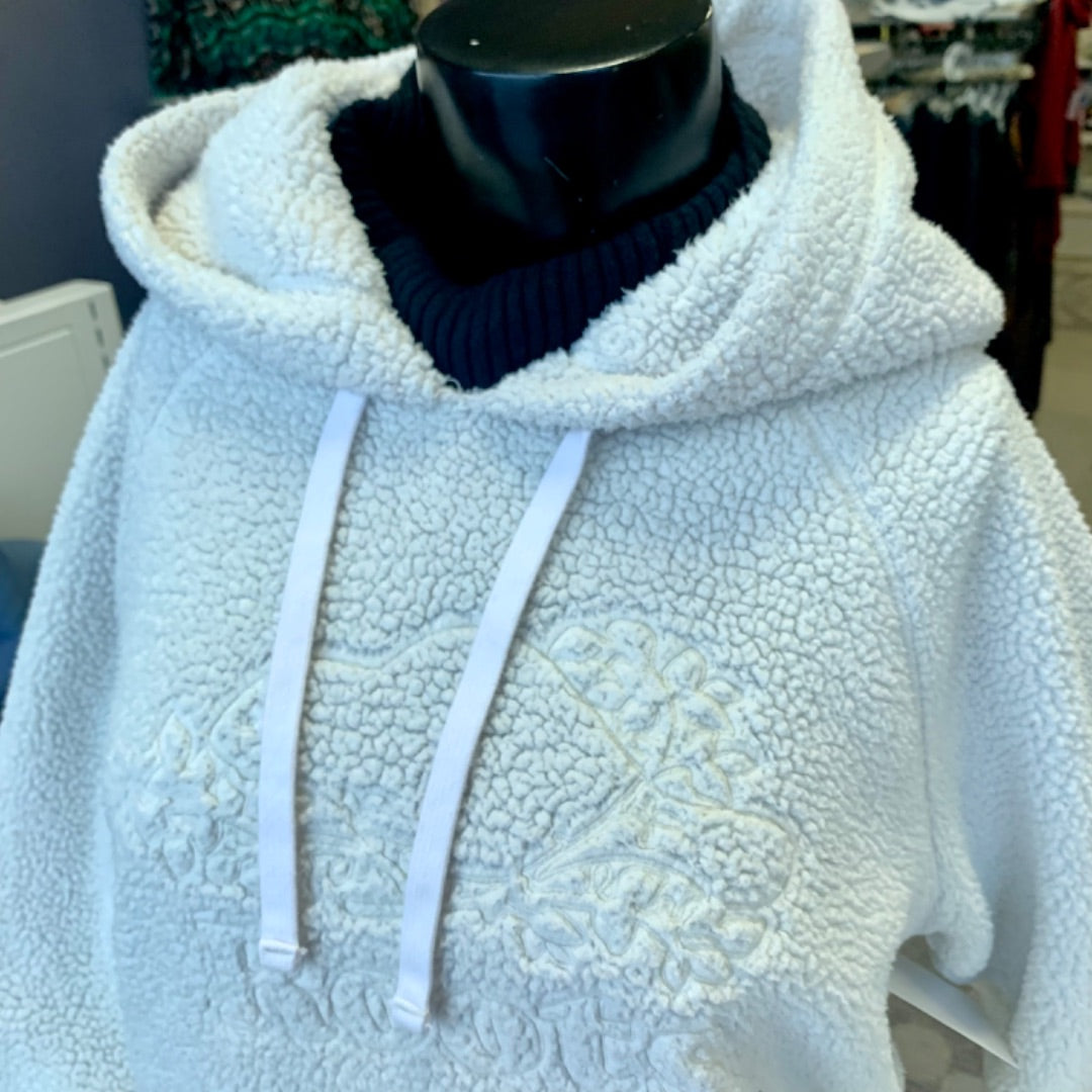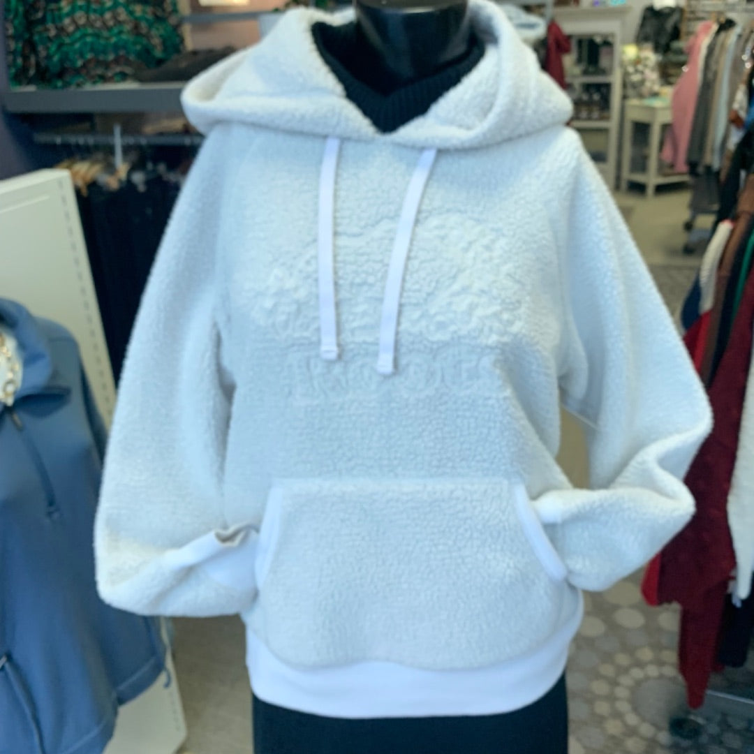 A teddy hoodie with kangaroo pocket.